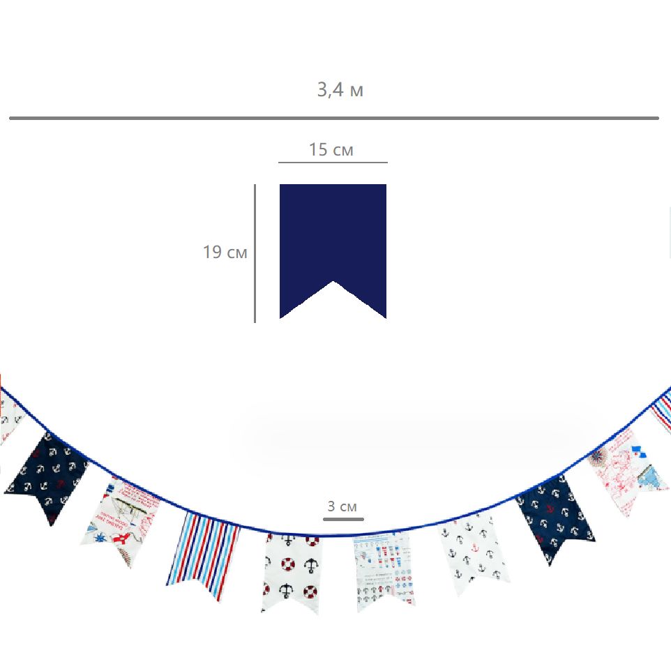 Гирлянда состоит из 12 флажков, общая длина составляет 3,4 м, расстояние между флажками 3 см, длина матерчатых флажков 2,1 м, длина лямок с обеих сторон по 50 см