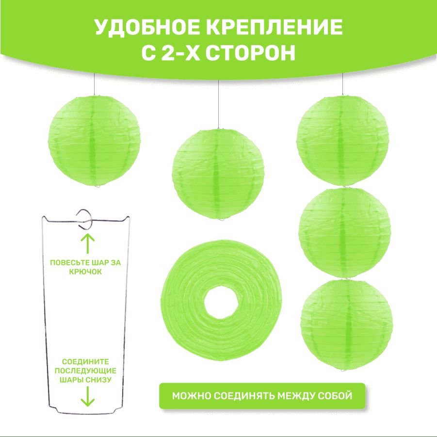 В комплект входит 8 бумажных фонариков и лента атласная.