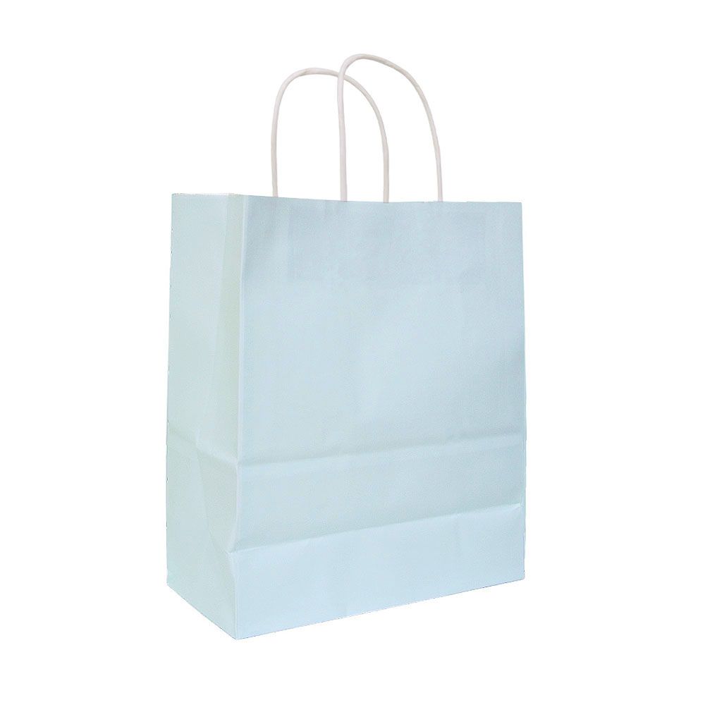Подарочный пакет из крафтовой бумаги пастельного оттенка с белыми бумажными ручками и белой внутренней стороной.