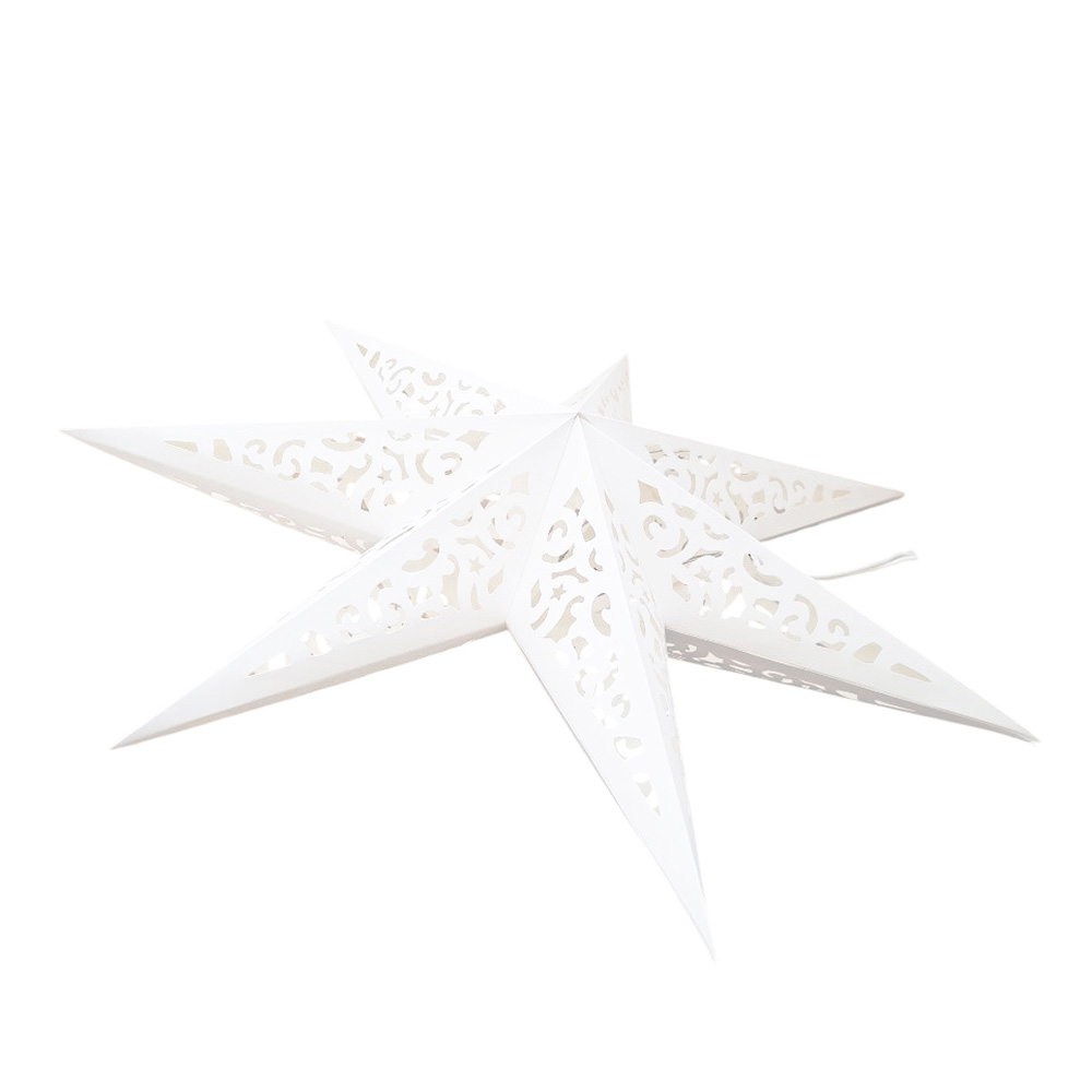 Семиконечная объемная звезда 60 см — великолепный декор из тонкого перфорированного картона. Создает красивые световые эффекты. Поставляется в сложенном виде, в комплекте шнур для фиксации объема и подвеса.